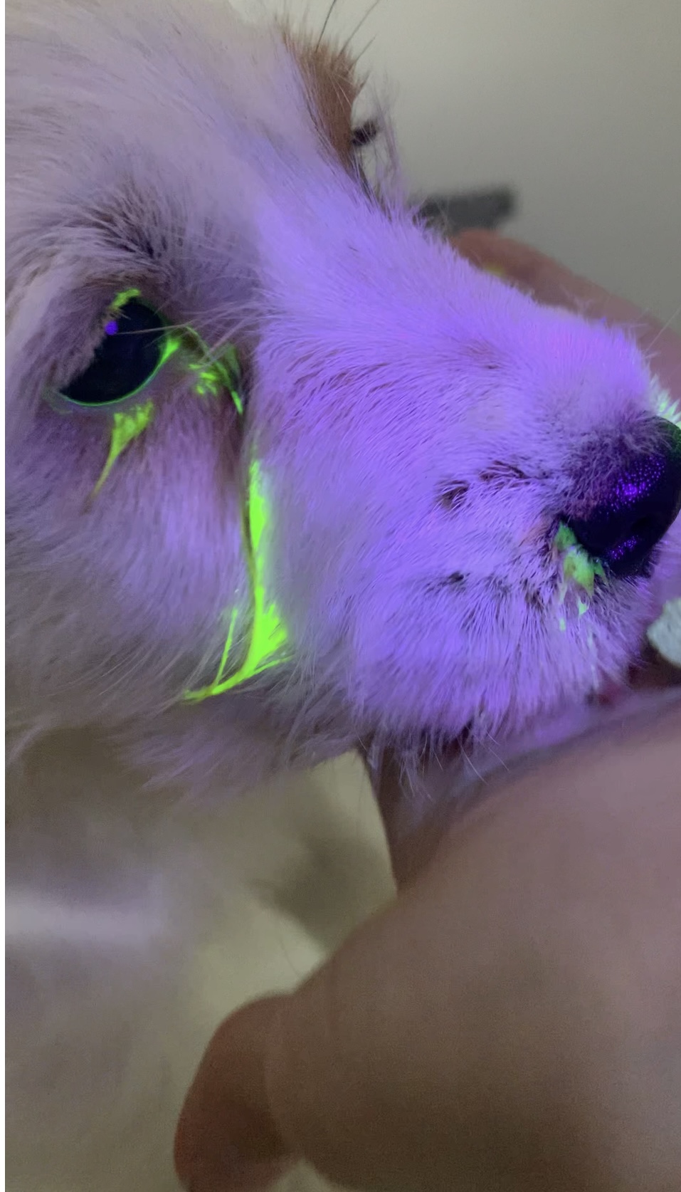 Consiste en aplicar un tinte especial (fluoresceína) sobre el ojo del perro y observar, bajo una luz especial, cómo se comporta la lágrima y si drena bien hacia la nariz.